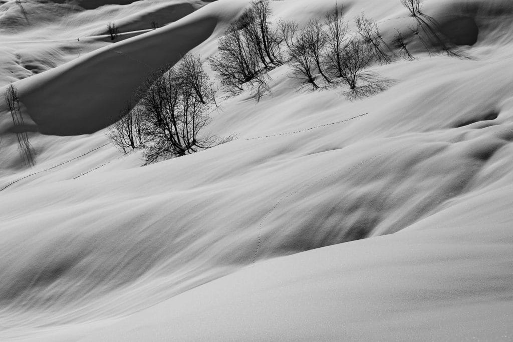 L'hiver s'écoule des sommets enneigés, s'enfonce dans la brume et ruisselle en neige poudrée sur les pentes à nu.